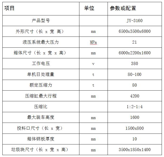 JY-3160 水平式四柱舉升垃圾壓縮設(shè)備主要用于對城鎮(zhèn)內(nèi)小區(qū)、居民點、學校、醫(yī)院、公園景區(qū)、廠礦和機關(guān)院校的生活垃圾以及固體廢棄物的收集、壓縮減容和封閉轉(zhuǎn)運。