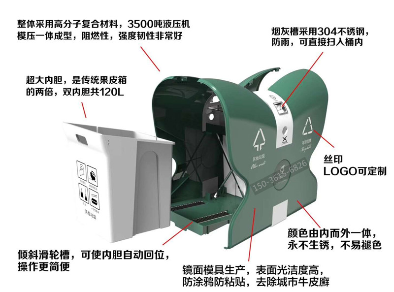 產(chǎn)品特點(diǎn): 鏡面模具生產(chǎn),表面光潔度高,防涂鴉防粘貼,防砸,耐燒,永不生銹,不易褪色,耐酸堿,易清洗,使用壽命長(zhǎng),具有天然的防盜功能;操作簡(jiǎn)單,深受環(huán)衛(wèi)系統(tǒng)客戶(hù)青睞。
